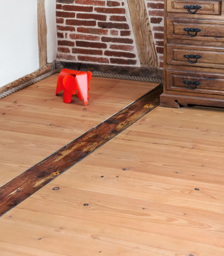 Interessant: die Oberflächen wurden weiß geseift veredelt, was dem Holzboden eine weiche Struktur verleiht. Es fühlt sich an, als würde man über Watte laufen.